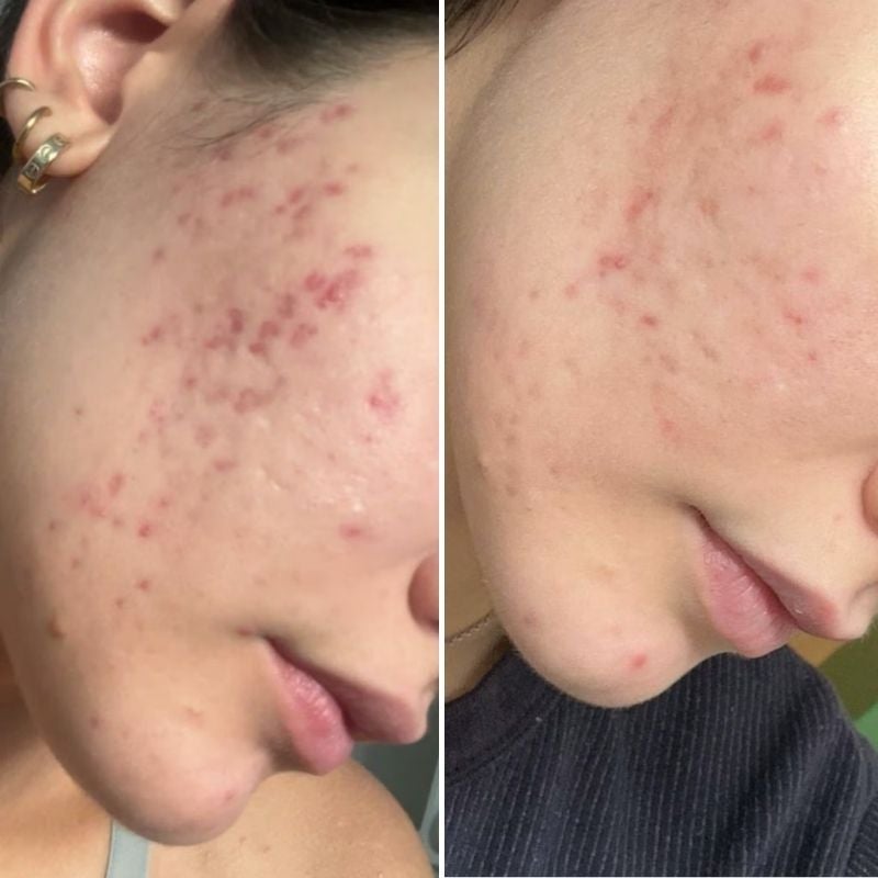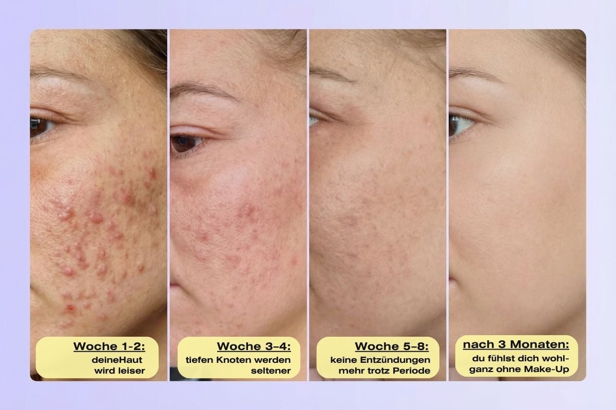 Woche 3–4: Die tiefen Knoten werden seltener. Wenn überhaupt noch etwas kommt, heilt es schneller ab. Kein tagelang pochender Knoten unter der Haut mehr.